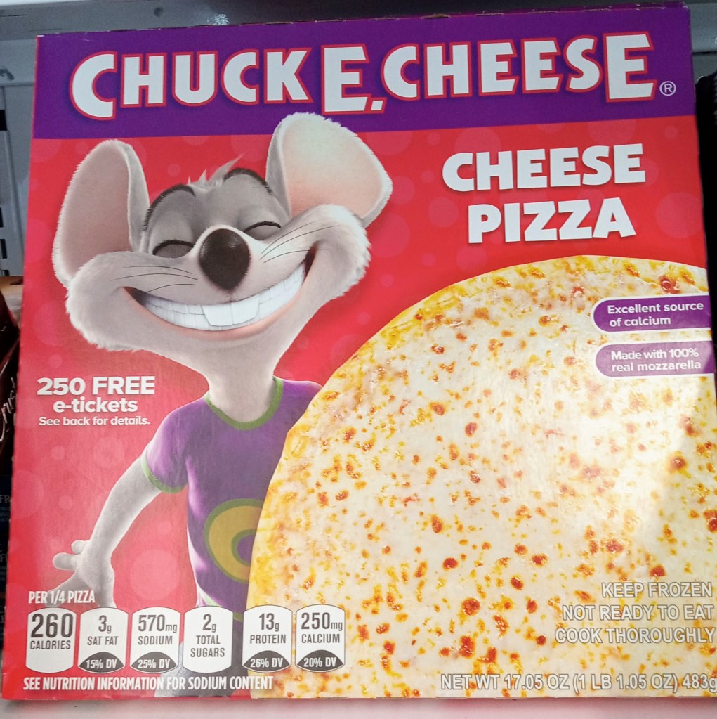 As I passed a freezer, something colorful caught my eye. It was a new box I had not seen before, and I was drawn to to it. As I got closer, I saw it was a Chuck E. Cheese frozen pizza. At first I was confused, and slightly disturbed, but then curiosity got the best of me. Like a train wreck, I couldn’t take my eyes off this strange anomaly in the freezer.