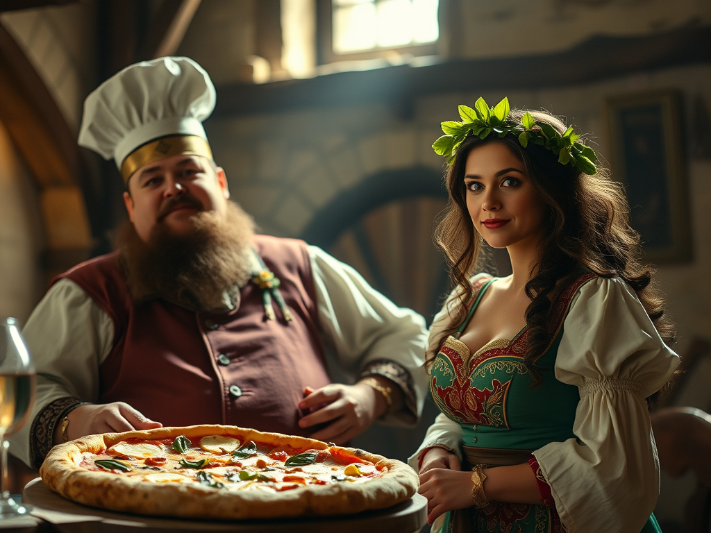 As the day dawned and the sun beamed warmly upon the village, knights, ladies, and townsfolk gathered in the square, the air fragrant with the aroma of fresh dough and bubbling cheese. The excitement was palpable; even the town guards forewent their usual vigil to sample the delights permeating the air. Duke Doughbell, the host and a man of significant girth from eating a lifetime of pizza, took the stage with a grand flourish. He cleared his throat, casting a mischievous glance at the two celebrity chefs. “Welcome, fair citizens of Cheezonia! Prepare your taste buds, for today, we embark on a journey of flavor!”